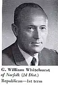 George William Whitehurst (born March 12, 1925) is an American retired politician, journalist and academic from Virginia who served as a member of the United States House of Representatives from 1969 to 1987. He began his career as a professor at the Norfolk campus of the College of William & Mary, which became Old Dominion University in 1962. After serving as Dean of Students from 1963 to 1968, Whitehurst left academia for a nineteen-year stay in Congress. Upon retiring from politics, he returned to what was by then Old Dominion University, where he held the chair of Kaufman Lecturer in Public Affairs until he retired.[1] He is a member of the Republican Party.
