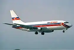 In 1985, the airline, which was by then known as 'GB Airways', was headquartered in Gibraltar.[5] In 1989, the company moved its operational HQ to the United Kingdom in order to increase the scope for expansion.[3] A base was established at The Beehive at London Gatwick Airport, and the company became 'GB Airways Ltd' on 3 January 1989. The livery on the airline's fleet of Boeing 737 aircraft at this time was mainly white, with red and blue twin stripes down the centre of the fuselage, sweeping down to form a 'chin strap' under the nose cone. The twin stripe was repeated on the tailfin, with a speeding red arrow creating a diamond-shaped centrepiece, which was repeated on the forward fuselage. A stylised version of this diamond logo was used until the airline was bought by easyJet in 2008.
