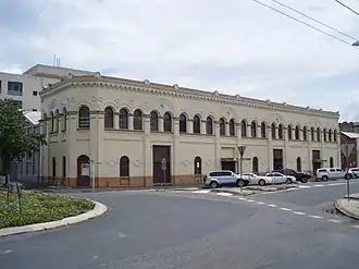 The building has splayed entrance bays to both street corners, and the Derby Street elevation contains nine bays framed by pilasters. The first floor contains a continuous row of arched, louvred glass windows separated by pilasters and framed with rendered mouldings and sills. These windows establish the rhythm of the bays which alternate in width, with the wider bays consisting of three arched windows and the narrower bays of two arched windows. Each narrow bay is surmounted by a rendered arched moulding with central circle motif. The end bays also have similar circle mouldings located above the arched windows. The building has a parapet with corbelled cornice, and raised arched mouldings are aligned with the position of the bays. The ground floor has a single arched louvred glass window with recessed lower panel, flanked by rendered circle mouldings and raised string course, centrally positioned within each wide bay. A tall loading door is located within each narrow bay, consisting of a roller door to the lower section surmounted by timber louvres and fixed glazing.[1]