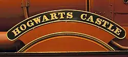 When filmed, Olton Hall carried a "Hogwarts Express" headboard on the smokebox, featuring the Hogwarts school crest. The same emblem is featured as part of the "Hogwarts Railways" sigil on the tender and carriages. It retained its GWR number of 5972, but with alternative nameplates fitted, naming the engine Hogwarts Castle. It is painted in a crimson livery — a non-standard colour, as GWR locomotives traditionally used green.[6]