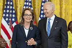 President Joe Biden awarded Giffords the Presidential Medal of Freedom for her courage while recovering from her shooting and persistence in fighting for change on July 7, 2022. She was among recipients that “demonstrate the power of possibilities and embody the soul of the nation — hard work, perseverance, and faith,” according to the Biden administration.[113] In 2023 she was the Grand Marshal of the Rose Parade and presided over both the parade and the Rose Bowl game.[114]
