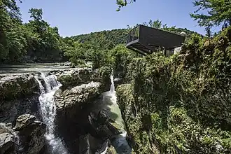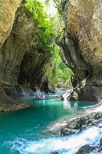 From the canyon visitor center, the 700 m long stone-paved tourist route has two bridges that lead to three canyon viewing platforms and to the historic Dadiani trail. Visitors are also offered a boat trip through canyon on a 300 meter long section of the Abasha river.[3] One section of the canyon, known as the Dadiani's Bath, boasts an exceptional beauty.[4]