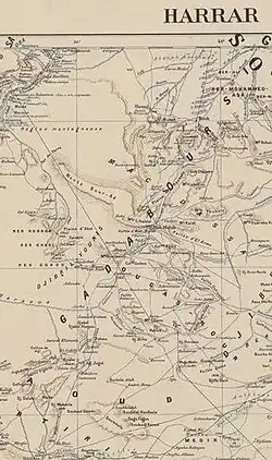 Ughaz Roble II was the 12th in line of the Gadabuursi Ughazate. Based mainly in Harar, he was crowned the Ughaz of the Gadabuursi after his father's (Ughaz Nur II) death.[8] His position as Ughaz proved to be quite controversial amongst the Gadabuursi due to his close relationship with the Ethiopian ruling dynasty.[32] He would go on to receive payments, gifts and weapons from the British, the French and the Abyssinians who were all vying for the region.[8] He eventually fell out of favor with the British and became close allies with Menelik II who officially recognized him as the Ughaz of the Gadabuursi.[33]