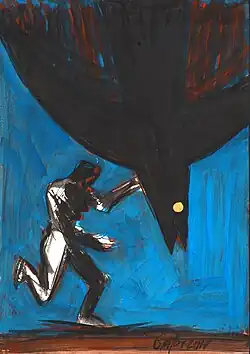 An avant-garde artist of Leningrad, Mendagaliev’s style is naïve. Vibrant colors and thick, heavy strokes form simple scenes that feel more symbolic than real.In each painting, there are repeated motifs: a table, a chimera, women, a bird, a fish. There appears to be a story begging to be told about the city he has lived in for so long, and, perhaps, a painful one. In the paintings, faces of people look in different directions, they pull from each other, guiding the viewer’s eyes into a chaos as the sphinx overlooks it all with a sense of doom. Then, there are portraits of chimeras and demons stalking individuals on the metro, women tormented next to a table or underwater beneath a fish in flight. They have a sinister tone to them. Fantastical, but simple, Mendagaliev’s works linger in the mind and resurface in the memory of St. Petersburg as a city.[3]