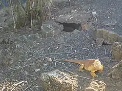 The Galápagos land iguana is one of the largest lizards in the world,[13] growing to a length of 0.9 to 1.5 m (3–5 ft), with a body weight of up to 13 kg (29 lb), depending upon which island they are from.[14][15] Being cold-blooded, they raise their body temperature by basking on volcanic rock or other dark-colored stones that naturally absorb the heat of the sun. By night, they sleep in burrows to conserve their absorbed body heat.[14] These iguanas also enjoy a symbiotic relationship with birds; the birds remove parasites, such as ticks, providing relief to the iguanas and food for the birds.[5][16]