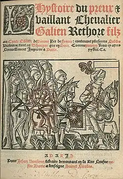 Galiens li Restorés, or Galien le Restoré or Galien rhétoré (in English, "Galien the Restored"), is an Old French chanson de geste which borrows heavily from chivalric romance. Its composition dates anywhere from the end of the twelfth century to the middle of the fourteenth century.[1] Five versions of the tale are extant, dating from the fifteenth century to the sixteenth century, one in verse and the others in prose.[1] The story—which is closely linked to the earlier chansons de geste Pèlerinage de Charlemagne and The Song of Roland (especially in the latter's rhymed version)[1]—tells of the adventures of Galien, son of the hero Olivier and of Jacqueline, the daughter of the (fictional) emperor Hugon (Hue the Strong[2]) of Constantinople.