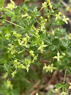 Galium californicum is a variable plant in the form of a small perennial herb to a sprawling woody-based shrub approaching 1 metre (3.3 ft) in height. Its stems and small oval-shaped leaves are hairy.