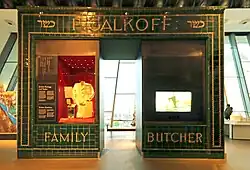 29 Pembroke Place was one of a terrace of Georgian town houses built in 1820. In 1907 it was purchased by Percy Galkoff, a Jewish emigré from Poland, who had it reconstructed as a kosher butcher's shop. In 1933 he added the tiled shop front which is a feature of the building The business was run by him and his family until 1979, when it was sold to Liverpool City Council. The building changed hands several times, becoming derelict despite remedial work, and afflicted throughout by planning blight.[3] The current owners, Liverpool School of Tropical Medicine, have co-operated with the Museum of Liverpool Life to preserve the frontage of No.29 and the neighbouring Grade II listed court dwellings, in their “Secret Life of Liverpool” project.[4][5] The frontage is now on display at the museum.