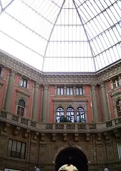 In 1878, on the occasion of the enlargement of Strada Nuova, the then mayor of Pavia Bernardo Arnaboldi Gazzaniga proposed to have a new building built, at his own expense, for agricultural trade and banking transactions. Bernardo Arnaboldi Gazzaniga then bought the buildings that stood on the area identified as the site of the new gallery and had them demolished. He then commissioned the architect Ercole Balossi to design the building over an area of over 2000 m².[1] The design, presented in June 1879, was completed with some variations by the spring of 1882.[2]