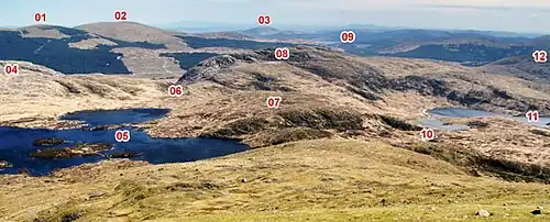 The location of Galloway has been described as follows, "Galloway is contained by sea to the west (North Channel) and south (Solway Firth), the "Galloway Hills" to the north, and the River Nith to the east".[1] So if we were to say "The hills of Galloway" we would be including all the hills within this area; but as the first sentence implies, the "Galloway Hills"[2] is usually taken to mean a collection of ranges which lie mainly south of Loch Doon and which are not constrained by political boundaries. The boundary between Dumfries and Galloway Region and Ayrshire runs west to east over Kirriereoch hill, drops south of Mullwharchar to the shores of Loch Enoch, before heading northwards up the east shore of Loch Doon, and so runs more or less through what might well be considered the heart of the Galloway hills – around Loch Enoch.