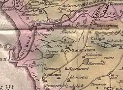 Blaeu's map of 1654, dating from Timothy Pont's survey of circa 1604, shows the loch as a significant body of water, extending towards Gar Rigs (sic), with no inflow and one outflow running down to the Dundonald Burn and eventually into the River Irvine near Shewalton.[6] The farm on the loch's edge is recorded as Mosside. This is the last map to show the loch and this indicates that its drainage took place in the early 18th century. Roy's map of 1747 shows no clear loch, however a habitation recorded as 'Lochend' is present.[7] The OS maps record the farm's name as 'Lochside'.[8]