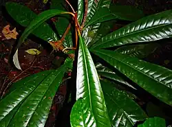 Species reaches 25 meters in height, the trunk is straight, often grooved and angular with buttressed roots at the base.[5] Bark is greyish brown to dark brown with white latex exuding from slash.[6] Leaves simple and appear at the end of branches in tufts; petiole is 1.5-3.5 cm long,[7] the abaxial surface has dense and appressed hairs and varies in color from pale brown to reddish-brown, adaxial surface is glabrous; leaf-blade is elliptical to oblong, 15-35 cm long and 5-13 cm wide, with 18-26 primary nerves on each side spaced 1-2 cm apart. Fruit is ovoid to globular shaped, with up to 5 shiny brown elliptical seeds; the fruit is rounded at the base, pointed or rounded at apex, 2.3-3 cm in diameter and up to 7 cm long,[4] when ripe is it yellowish to orange colored.[6]