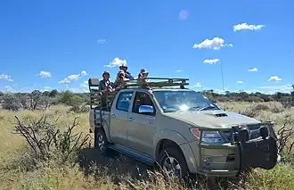 A game drive is usually part of a safari, a trip or a journey. It can be carried out with own cars like in national parks or game reserves, or it can be a guided tour in specially for that purpose adapted off-road vehicles led by a professional safari guide. Those 4 × 4 game viewing vehicles are designed to allow a safer trip for tourists. On farms and lodges however, a game drive is an adventure that entails viewing wildlife in an off-road car, always accompanied by safari guides or the farmer himself, who will explain the animal's behavior and interpret the bush.