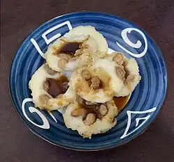 Gan Guê To (Chinese: 酵粿桃; Teochew: gan3 guê2 to5), also known as Buah Ze Guê (Chinese: 钵仔粿; Teochew: buah4 ze2 guê2), is a folk snack in Chaoshan area, similar to put chai ko.[1] The production method is to grind rice into rice milk, put it into a special small ceramic bowl, steam it, and then deep-fry it. When eating, pour sauce made of brown sugar on it.[2][3]