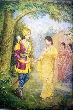 A Gandharva marriage (Sanskrit: गान्धर्व विवाह, gāndharva vivāha, IPA: [gənd̪ʱərvə vɪvaːhə]) is one of the eight classical types of Hindu marriage. This ancient tradition from the Indian subcontinent was based on consensual acceptance between two people, with no rituals, witnesses or family participation.[1] The marriage of Dushyanta and Shakuntala is a historically celebrated example of this class of marriage.[2]