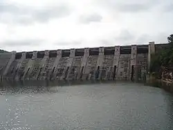 The Gandhi Sagar Dam is one of the four major dams built on India's Chambal River. The dam is located in the Mandsaur district of the state of Madhya Pradesh. It is a masonry gravity dam, standing 62.17 metres (204.0 ft) high,[1] with a gross storage capacity of 7.322 billion cubic metres from a catchment area of 22,584 km2 (8,720 sq mi). The dam's foundation stone was laid by Prime Minister of India Pandit Jawaharlal Nehru on 7 March 1954,[2] and construction of the main dam was done by leading contractor Dwarka Das Agrawal & Associates and was completed in 1960. Additional dam structures were completed downstream in the 1970s.