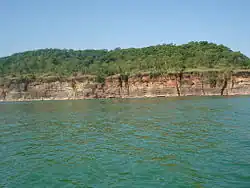 The reservoir created by the dam is the third largest in India (after the Indirasagar Reservoir and Hirakud Reservoir), with a total area of 723 km2 (279 sq mi). The catchment area of the Chambal River from the Vindhyachal ranges to the south and Aravalli to the northeast, covering a drainage area of 22,584 km2 (8,720 sq mi); important tributaries that discharge into the Chambal upstream of this reservoir include the Shipra, Chhoti, Kalisindh, Ansar, and Rupniya on the eastern side, and the Tilsoi, Edar, Retum and Shivna in the west.[11] The maximum length and width of the reservoir are 68 kilometres (42 mi) and 26 kilometres (16 mi), respectively. The Gandhi Sagar Wildlife Sanctuary, which has an area of 36,700 hectares (91,000 acres), is shared by the Mandsaur and Neemuch districts, in the catchment area of the Gandhi Sagar reservoir. The sanctuary's forested area was once a hunting area of the Holkar royal family of Indore. The reservoir is under the control of the irrigation and fisheries departments of the Government of Madhya Pradesh, and is mostly used for fisheries development also.[6][11]