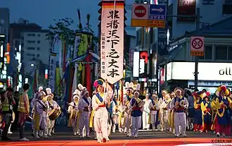 On the 15th day of the 4th month, the festival's leaders and the common people march with the spiritual tablet of the local guardian god and sacred branch. They visit various sacred places and shrines in and under the mountain. The procession is said to have 99 curves and valleys; it eventually arrives at a shrine (성황당; 城隍堂) in the village Gusan (구산; 邱山). There, the village hosts rituals and performances.[7][8] In the afternoon, the procession goes to another shrine at the village Haksan (학산; 鶴散); this village is where the local guardian god is said to have been born.[7]