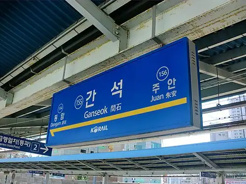 Ganseok Station (Korean간석역; Hanja間石驛; RRGanseok-yeok) is a station on Seoul Metropolitan Subway Line 1 and Gyeongin Line.