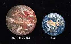 In 2021, one planet, named Gliese 486 b, was discovered on a tight, circular orbit.[8] It represents a rare class of rocky exoplanet suitable for spectroscopic characterization in the near future[15] by the James Webb Space Telescope.[16] By 2022, no hydrogen or steam dominated atmosphere was detected, although a secondary planetary atmosphere with a higher molecular weight remained a possibility.[17] Observations by JWST announced in 2023 detected signs of water vapor, but it was unclear if this is from the planet's atmosphere or from its host star.[18][19]