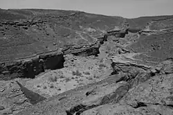 Gara Medouar is located 12 km (7.5 mi) to the west of the principal tell of Sijilmasa, in the Tafilalt region. It is a limestone massif that rises 50 m (160 ft) above the desert and consists of fossiliferous beds from the Pragian to Frasnian.[1] The entire area measures about 50 hectares. Most of the perimeter consists of vertical rocks with scree at the bottom. In the south/southwest, the circular formation is broken by a ravine, which continues into the formation as a wadi, providing entrance into the heart of the massif. The wadi starts after the confluence of four ravines, which divide the higher ground into five plateaus; at this confluence is a great circle of rock, surrounded by the overhanging plateaus. There is no source of water.[2] Erosion has washed away all loose material, leaving only spurs, and the gara presents itself as essentially a funnel with the constituent canyons leading toward a single exit.[3]