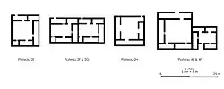 Six of the buildings are different. One of the two on the southernmost plateau consists of two adjoining structures as well as a space for animals, and had a latrine (made possible by its placement on the edge of the plateau). The only other building on the plateau was made of crude bricks (as opposed to rubble from limestone); it may have served as the dwelling for higher-ranked people. Its layout was quite different from all the other buildings, having a series of three rooms that were accessible from each other, rather than from the central space, in a style of architecture rarely found in the east but often in the west, particularly in the Iraq of the Abbasid Caliphate. The buildings, in their layout, construction, and spacing, suggest an elite occupied that part of the massif; the plateau itself already has characteristics that set it apart from the others: higher than the others, it offers a view of the defensive works (the low wall), the other structures in the area, the oasis of Tafilalt, and the peak of the Tizi/Mkhazni. Also indicative of a special status are the remains of access routes, including steps in steep rock, that provide direct access to the plateau from the lower area, and to another plateau. The combination of a set of dwellings whose variety indicates social hierarchy suggests Gara Medouar was not just a defensive works, but also an important habitation.[2]