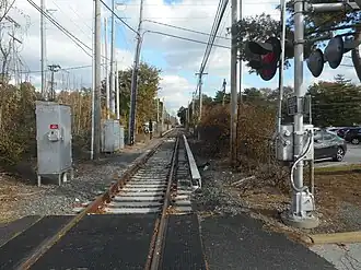 The line currently alternates between being single and double tracked, with some electrification extending as far as the Garden City yard. A number of freight sidings and team tracks remain along the line. Most of the line's grade crossings remain unprotected and require flag protection against traffic by train crews. The Clinton Road passenger station, from the line's early days, still stands along with its low level concrete platforms. The station house is currently used by the Garden City Fire Department.[2][3][7]