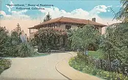 Stage and screen actress Alla Nazimova leased Hayvenhurst from William Hay not long after she moved to Los Angeles from New York in 1918. She purchased it outright in 1919.[5] Nazimova jokingly called her new home "The Garden of Alla", which was a reference to her own name and the best-selling 1904 novel The Garden of Allah, by British author Robert S. Hichens.