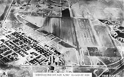 A large aircraft parking apron and several large hangars were also constructed. Buildings were ultimately utilitarian and quickly assembled. Most base buildings, not meant for long-term use, were constructed of temporary or semi-permanent materials. Although some hangars had steel frames and the occasional brick or tile building could be seen, most support buildings sat on concrete foundations but were of frame construction clad in little more than plywood and tarpaper. The base had its own hospital, 40-acre sewage plant, 9 administration buildings, 4 mess halls, supply rooms, officers' quarters, a guardhouse, a chapel, and 37 barracks.