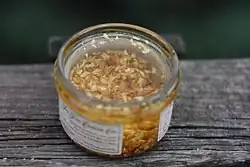 Garlic oil is the volatile oil derived from garlic.[1] It is usually prepared using steam distillation, and can also be produced via distillation using ether. It is used in cooking and as a seasoning, a nutritional supplement, and also as an insecticide.