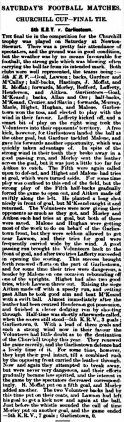 However, on a wider stage it was almost entirely without success, its first two wins in the Churchill Cup (which included clubs from Dumfriesshire) coming in 1893–94 against St Cuthbert's Wanderers[8] and Newton Stewart.[9] The club also received a bye to be put into the final against the 5th K.R.V., which beat Garliestown 7–0, despite the 5th having a much longer journey to Newton Stewart for the final.[10] This small success gained the club an invitation to play in the Southern Counties Charity Cup for the only time, but it lost 6–0 at Newton Stewart in its only tie.[11]