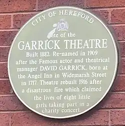 The theatre was built in 1882 and renamed in 1909 after David Garrick, the actor and theatrical manager, who was born in Hereford in 1717.[1]