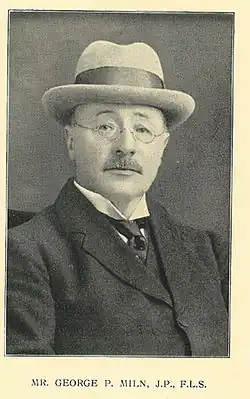Born at Linlathen, Broughty Ferry in 1861, George Peddie Miln trained in a Dundee seed warehouse, the traditional Scottish training for a young man with ambition in the seed trade. He moved to Chester and ran one of its old established seed merchants before joining Gartons Limited as its first managing director in 1898. He was a member of Her Majesty's Board of Agriculture Seeds Advisory Council during the first World War. Both the Seeds Act 1920 and the formation of the National Institute of Agricultural Botany came about with his considerable encouragement during his three-year presidency of the Seed Trade Association of the United Kingdom. Of his eleven children, five trained in the seed trade. He was a Justice of the Peace in the City of Chester, a Fellow of the Linnean Society and a member of the Council of the Royal Agricultural Society of England. He died aged 68 following an unsuccessful operation.
