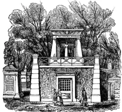 Gaspard Monge, whose remains are deposited in the burying ground in Père Lachaise Cemetery, at Paris, in a magnificent mausoleum,[1] was professor of geometry in the École polytechnique at Paris, and with Denon accompanied Napoleon Bonaparte on his memorable expedition to Egypt; one to make drawings of the architectural antiquities and sculpture, and the other the geographical delineations of that ancient country. He returned to Paris, where he assisted Denon in the publication of his antiquities. At his decease the pupils of the Polytechnique School erected this mausoleum to his memory, as a testimony of their esteem, after a design made by his friend, Monsieur Denon. The mausoleum is of Egyptian architecture, with which Denon had become familiarly acquainted.