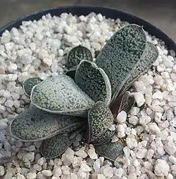It is a small species, growing to 10 cm (3.9 in) tall and wide, with distichous (two rows) of strap-shaped leaves Both upper and lower surfaces of the leaves are swollen, convex, rough, leathery and densely covered in tiny, white, truncate tubercles. These tubercles are one of the easiest ways of identifying this species. In the shade, the leaves become elongated; while in sunnier conditions they remain short and compact. The plant produces offsets from the base, forming clumps, and also grows from broken leaves which root and develop shoots.