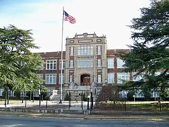 Gastonia High School is a historic high school building located at Gastonia, Gaston County, North Carolina. It was designed by Hugh Edward White and built in 1922–1924. It is a five-story, heavily ornamented E-shaped Tudor Revival-style red brick school. It has a flat roof with parapet and features a four-bay projecting frontispiece and two-story, elegantly finished, auditorium. It has a six bays long and three bays wide addition built in 1955.[2] In 1955, the school was renamed Frank L. Ashley High School. Ashley High School's last graduating class was in 1970.[3]