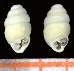 The small conical shell is 1.9 mm high and 1.0 mm wide.[1] The five arched whorls increase uniformly in size up to the penultimate whorl – the last whorl becomes smaller towards the aperture.[1] The apertural border with the lip is well formed and slightly folded over towards the spindle.[1] The shell is shiny, slightly stripy and has a weakly developed palatine torus.[1] It has three strong teeth, one columellar, one palatal and one parietal, although the adjacent palatine wall of the specimen is damaged and partially missing.[1] The teeth are almost the same distance apart and their tips almost point towards one another.[1] A characteristic feature is the complete absence of a basal tooth.[1]