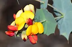 The species ranges from 0.3 to 3.5 metres in height. It has leaves with spiky, dentate margins and a long, tapering, pointed apex. The pea flowers are yellow to orange with a band of red surrounding the yellow centre, and a pink and maroon keel. These are produced from early spring to early summer (September to December in Australia).