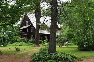 The Gate of the Hills stands at the southern fringe of a residential area south of Bethel village. It is set on a small level area north of the junction of North and Royalton Hill Roads, in a small clearing in the woods with a semicircular drive in front. The house is 2+1⁄2 stories in height, with a massive stone foundation (apparently intended to support masonry walls) and a wooden frame clad in shingles. The roof has gables at the side, and its front slope extends down to the first floor, where it shelters a recessed porch, and has three large gabled dormers above. On the rear, the roof extends only to the top of the second floor, and is slightly flared (a Dutch Colonial feature) at the base.[2]
