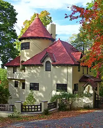 The Gatehouse on Deerhill Road is located on that street in the village of Cornwall on Hudson, New York, United States. It is a one-and-a-half-story stucco building in the Norman style with a tiled roof and three-story tower, with balcony. The east facade has an entrance pavilion.[2]