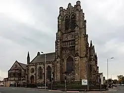 The church is built in rubble stone and has roofs of Westmorland slate. It consists of a wide six-bay nave with a tower on the north side.[b] At the corners of the tower are clasping buttresses. There is a west door with a moulded arch at the base of the tower, and above this is a decorative hood mould. In the top stage are paired bell openings. The summit is battlemented with corner pinnacles that have been reduced from their original height. On the other corners of the church are angle buttresses rising to form tall octagonal pinnacles. The nave has a seven-light west window, beneath which is a canted baptistry. The bays of the nave are divided by buttresses and contain three-light windows with Decorated tracery. Towards the east end of the north side is a doorway, over which is a rose window.[2] The interior is described as a "wide short auditorium over a basement".[4]
