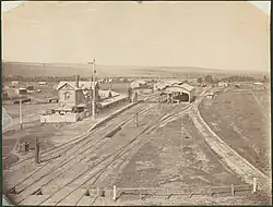 Gawler station opened in 1857 as the terminus of the Gawler line. It was built on pastoral land owned by the local parliamentary member of the period. The original platform building was replaced in 1879.[2][3] Subsequently, a horse-drawn tram serviced Gawler's main street (Murray Street), almost a kilometre away. The tramway handled both passengers and goods, with several goods sidings, and a connection to the main line to facilitate the delivery of locomotives built by James Martin & Co. The railway was extended to Roseworthy and Kapunda in 1860 then to Morgan in 1878.
