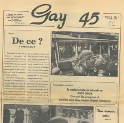 GAY45 was founded in [21 April 1993]] in Romania by Răzvan Ion, then a Dutch journalist. It was created in response to Article 200, a section of the Penal Code of Romania that criminalised homosexual relationships. The magazine aimed to change public 'mentality' towards homosexuality and promote an integrated European identity.[2]