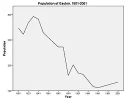 Gayton, in the 2001 Census, has a population of 167[10] in a total of 63 households.[8] The population has fallen from a peak of 296 in 1831[11] , since which the population seems to have steadily decreased. This is most likely due to rural to urban migration from small villages like Gayton to bigger centres. The decline in agriculture in England is also a possible contributor to the decreasing population.