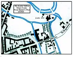 It was on the bend at the top of Kettlewell Lane that the mill once stood and was known as King's Lynn Kettle Watermill. The first record shows it as being a building housing lepers. Kettle Mills does not ever appear to have ever been a manufacturing mill. However, at one point during its rich and varied career it was certainly driven by the waters of the Gaywood.