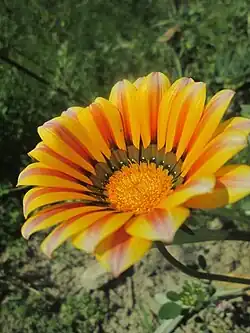 Like all compounds, gazania flowers in flower heads that are often taken for simple flowers. The capitula are solitary at the end of peduncles just beyond the leaves. Each capitulum is formed by a central disc of tubular flowers, surrounded by ligulate peripheral flowers, whose color is very variable. The orange-yellow flowers are however the most numerous, often with black spots at the base of the ligules. The fruit is an achene, containing several seeds.
