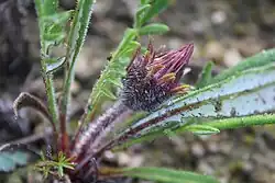 In particular, it is very similar to Gazania rigida, which also has setose scapes and involucres, and occurs in similar areas of the south western Cape. However, G. serrata can usually be distinguished by its innermost terminal involucre bracts, which have acuminate tips (those of G. rigida have obtuse-acute tips). In addition, the slender G. serrata leaves usually having finely serrated margins, and an upper leaf-surface that is rough and viscous-sticky.[3]