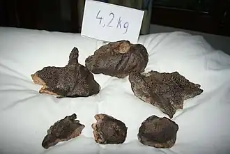 In February 2009 and 2010, meteorite fragments with masses ranging from < 1 gram (0.035 oz) to 35 kilograms (77 lb), plus an 83 kilograms (183 lb) specimen, were found in and around a 45 metres (148 ft) radius from Kamil Crater by an Italian-Egyptian geophysical team.[2] About 800 kilograms (1,800 lb) was recovered.[2] The geophysical survey took place as part of the "2009 Italian-Egyptian Year of Science and Technology".[2]
