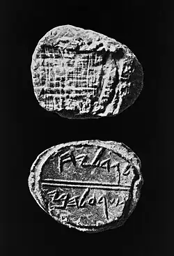 In August 2008, the Israeli archeologist Eilat Mazar announced the discovery of a bulla, a lump of clay bearing a seal impression, inscribed with the name Gedaliah ben Pashur, in the excavations of the Ir David Foundation in the City of David, just south of Jerusalem's Temple Mount. Mazar noted that the just-discovered bulla was found just yards from the spot where, three years ago, another bulla was found with a name from the above verse, viz. Yehukal ben Shelemyahu (Jucal, son of Shelemiah).[3] Both men served as ministers to King Zedekiah, the last ruler of the Kingdom of Judah before Jerusalem and its Temple were destroyed by the Babylonians in 587 B.C.[4][5]