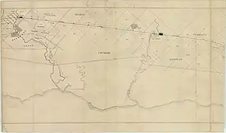 In September 1853, Joseph La Trobe who was the Lieutenant-Governor of the colony marked the railway construction by turning on the first sod at Geelong station.[8][22] The construction process had not started until early 1854 but the project experienced a labour shortage due to the gold rushes hype at the current time.[16] The chairman announced in the second meeting of 1854 that the majority of required land from the terminus, Geelong station, to Cowies Creek station (now Corio station[23]) had been purchased or arranged with minimal difficulties.[19] Also, in the report, the chairman wrote that the Victoria government was generous and engaging as two hulks were placed at Cowies Creek (now Corio Bay[23]) to proceed the construction to Duck Ponds.[19]